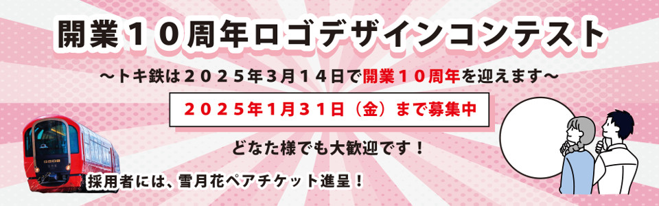 2025年3月14日にトキ鉄の開業10周年を迎えることを記念して、ロゴマークのデザインコンテストを開催します。採用された方には雪月花ペアチケットを進呈! 皆様の自由なアイデアをどうぞお寄せください。