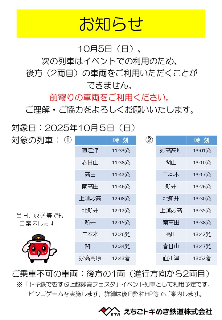 10/5(日) 定期列車2両目でのイベント開催について お知らせ 2025-10-02 10/5(日)「トキ鉄でむすぶ上越・妙高フェスタ」イベント列車運行に伴い、 次の列車の2両目の車両はご乗車いただけません。 皆さまのご理解とご協力、どうぞよろしくお願いいたします。 ・直江津11:33発 妙高高原行き ・妙高高原13:01発 直江津行き ※1両目(前寄り)の車両をご利用ください。 ※イベント列車参加希望の方は、こちらの記事をご確認ください。 ※こちらからPDFでもご覧いただけます。