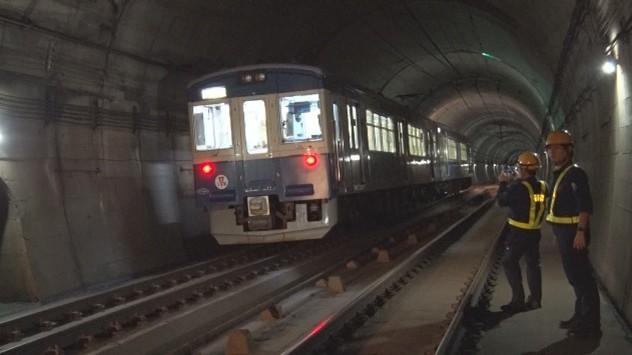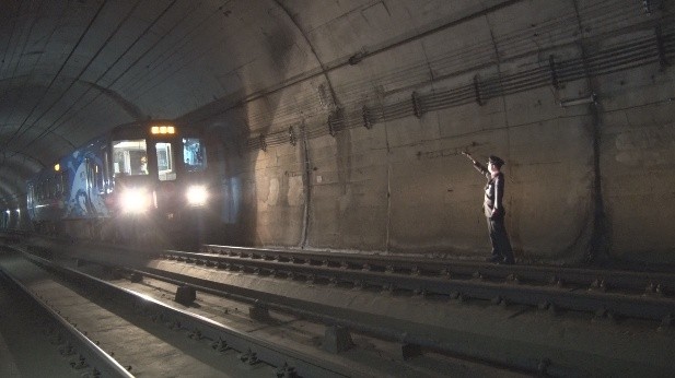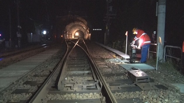 まず、ET127系1編成2両を、日本海ひすいラインの谷浜駅と直江津駅間にある湯殿トンネル内上り第一閉そく信号機外方20mに停車させました。