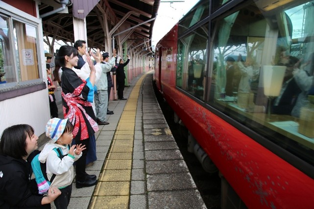 雪月花の到着時間になるとお出迎えやお見送りのため、ホームに人が集まり、列車に向かって手を振る姿が見られ、ご乗車のお客様も大喜びしていらっしゃいました。