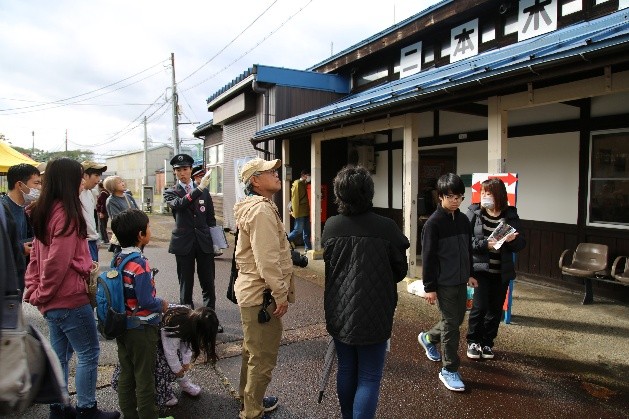 トキ鉄駅ツアーは普段は入れない文化財の建物などにも入れるとあって30人ほどが集まり、駅係員の説明に耳を傾けていました。