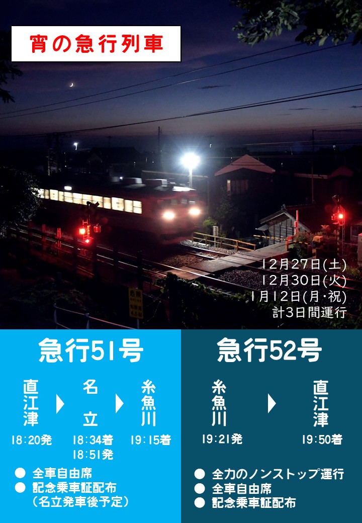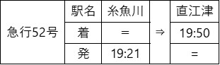 ⑷ 復路となる「急行52号」では糸魚川-直江津間ノンストップ運行を行います。