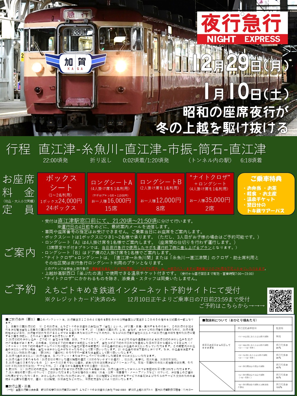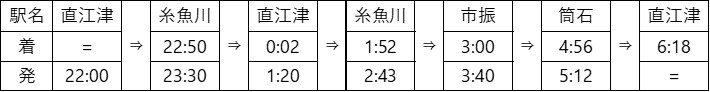 1往復目の「直江津→糸魚川間」または、「糸魚川→直江津間」のクロザ利用と夜行急行ロングシートを合わせてご利用いただけるプランです。