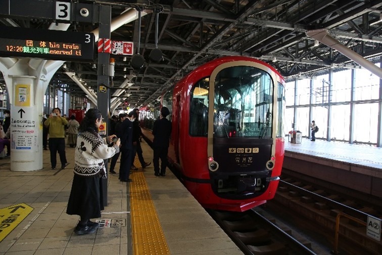 富山駅や高岡駅などの停車駅では、雪月花のファンの皆様や、鉄道好きの皆様が集まりホームは大変混雑していました。雪月花を一目見たいという皆様が、到着場面を出迎え、写真を撮るなどして楽しまれていました。