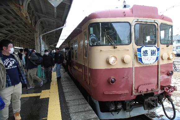 国鉄形観光急行として親しまれた413・455系交直両用電車は2021年7月に運行を開始し、4年半の間、日本海ひすいラインを中心に急行列車として運行し、お食事つきコースの設定や、富山県の富山駅乗り入れなどの企画列車としても人気を集め、大勢の皆様に愛されてきました。