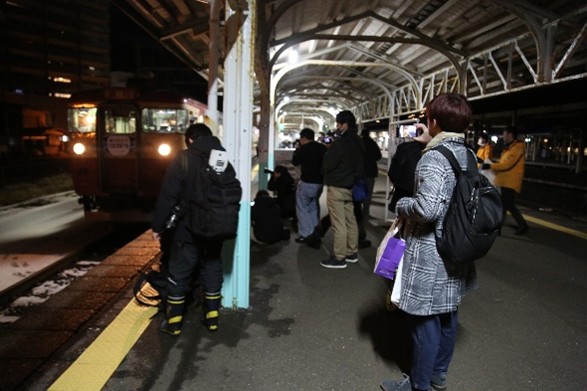 臨時急行51号・52号「宵の急行」は国鉄色のラストランとなり、大勢のファンがご乗車になりました。運転士は朝の急行1号から、この列車の人気運転士 坂東 正幸さんが務めました。