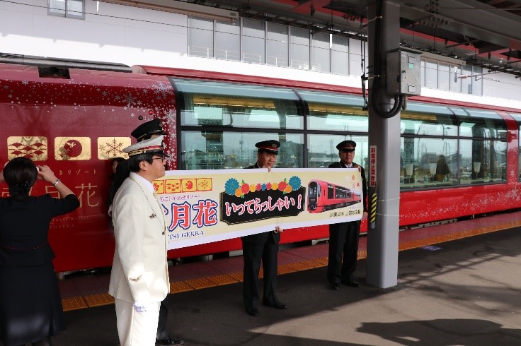 上越妙高駅では、「行ってらっしゃい」などと書かれた横断幕が掲げられ、関係者が出発を祝いました。12時14分に、雪月花が新潟に向けて出発しました。