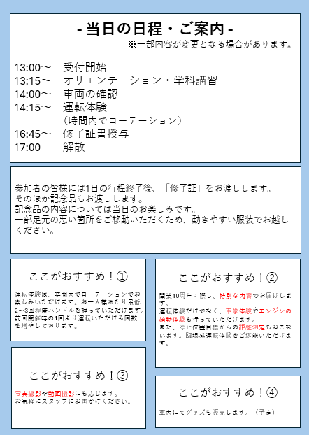・片道あたり約150mを往復する運転体験です。約2時間30分にわたる運転時間の中で、ローテーションにて運転体験をおこなっていただけます。