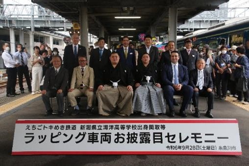 糸魚川を全国にPR!海洋高校出身の大関 大の里関をはじめ、4名の関取や地域の特産品が載った車両が完成し、出発式が行われました。