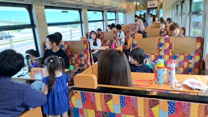 途中、有間川駅付近で日本海が一望できると、「すごい」「きれい」などと歓声が上がりました。海が見えるとテンションも上がりますね。