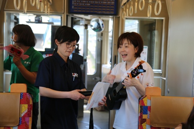 園長の五十嵐先生のウクレレ演奏に合わせて、「線路は続くよどこまでも」などを合唱しました。