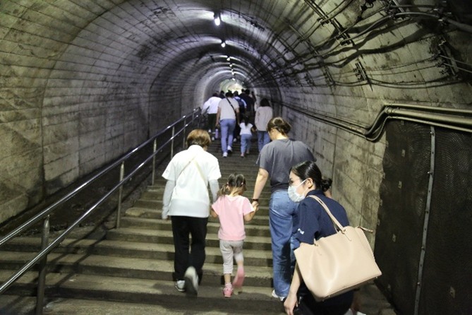 トンネル地下駅の筒石駅では、地下40メートルから地上まで、駅探索の大冒険を行いました。園長先生や保護者と手をつないだりして、約280段の階段を一気に駆け上がりました。