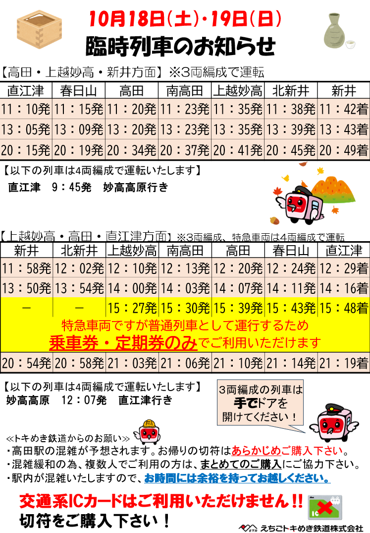 【10月18日(土)・19日(日)】越後・謙信SAKEまつりに伴う臨時列車のお知らせ お知らせ 2025-10-07 10月18日・19日の「越後・謙信SAKEまつり」開催に伴いまして、臨時列車を運行いたします。 3両編成で運行の列車には、イベントに合わせたヘッドマークや行先表示板(サボ)の掲出を予定しております。 「越後・謙信SAKEまつり」のご来場にぜひトキ鉄をご利用ください。