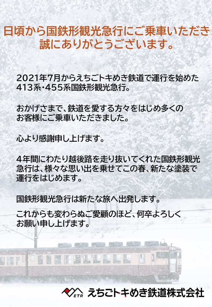 えちごトキめき鉄道では、413・455系電車「国鉄形観光急行」の現行塗装「交直流急行色」での運行終了に合わせ、