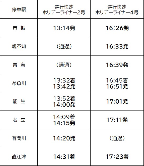 ③当日、ホリデーライナー1~3号の能生駅到着時に、