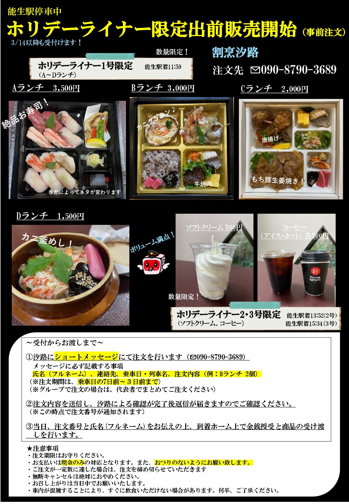 ホリデーライナー運行日限定で能生駅前「割烹 汐路」さまによる出前販売サービスを開始いたします。