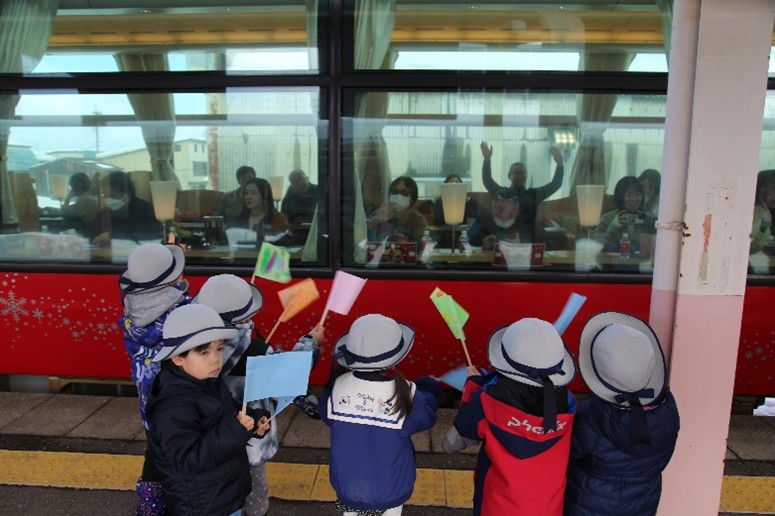 新井駅を発車する雪月花に向けて大きく旗を振る園児に、お客様も心を込めて、大きく手を振り返してくださり、「また来てね―」と叫ぶ子供たちの声が、いつまでもホームに響き渡っていました。