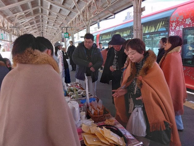 今年は、例年運行している高田コースの設定はありませんでしたが、駅のホームで特産品を販売しながらお客様をおもてなししてくださり、大好評となっています。