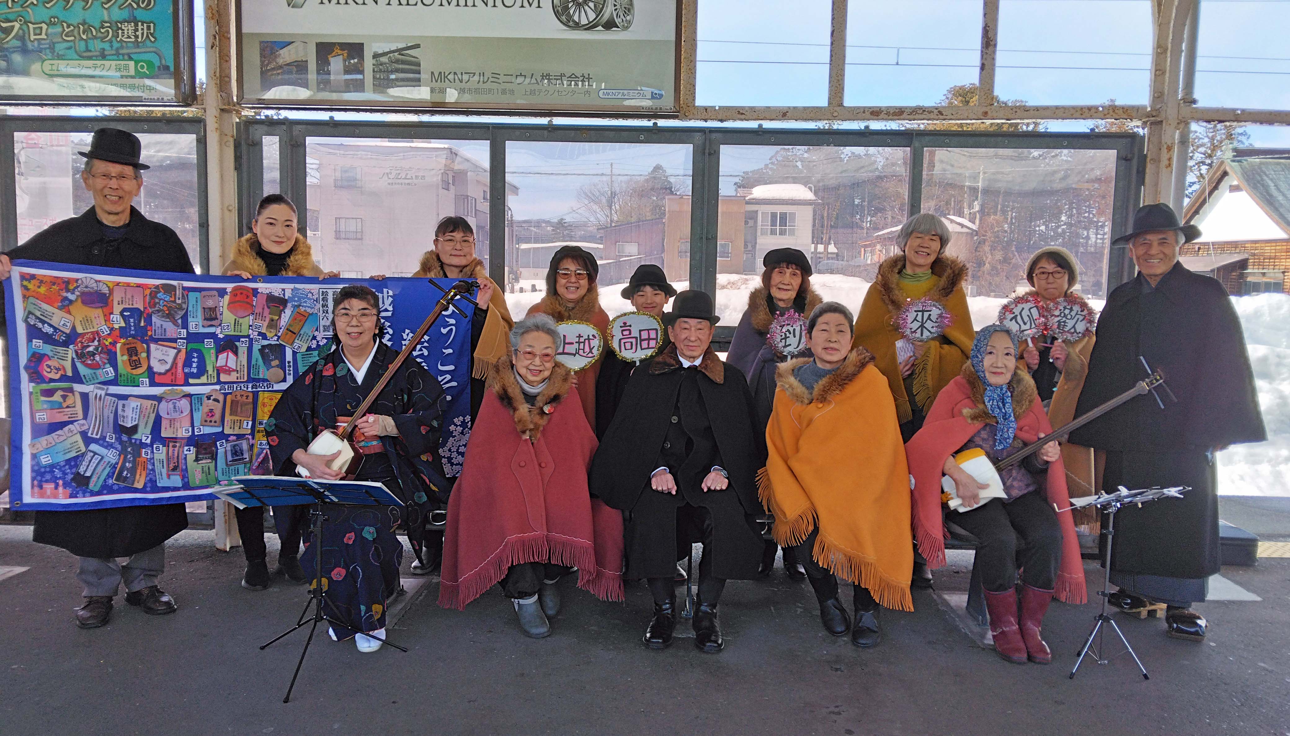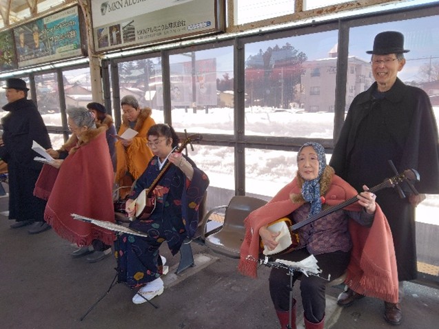 雪月花高田おもてなし隊の皆様は、冬期運行高田コースの際、雁木通りで雪国装束を身にまとい、三味線や歌などを歌いながら、お客様のおもてなしを行ってくださっていました。