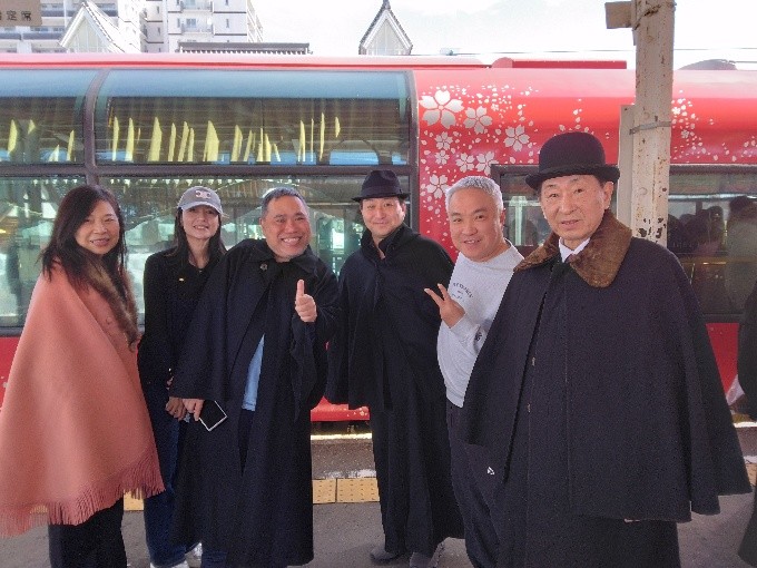 この日はおもてなし隊の要請を受けて、インバウンド客にも好評な雪月花のおもてなしの様子を見学しました。当日は台湾などのお客様がご乗車になっており、市長と大喜びで記念撮影に臨んでいました。