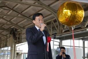 鉄道友の会会長須田寬氏があいさつに立ち、「えちごトキめきリゾート雪月花は、新潟トランシス製の車体に燕三条の金属器を調度品にしつらえている上、食事には地元の食材を使っているなど、全て新潟県産。この雪月花を今後の地域の振興の象徴にしていただきたい。」