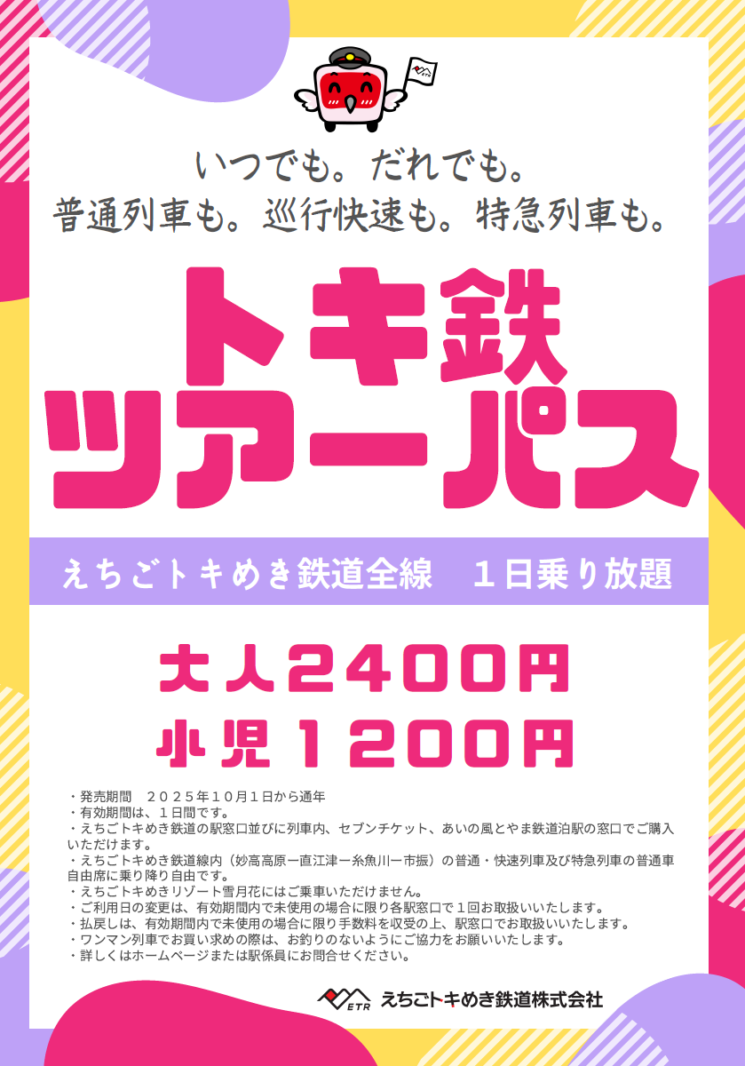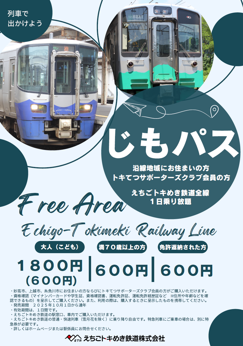 妙高市、上越市、糸魚川市在住の方ならびにトキてつサポーターズクラブ会員の方限定の、えちごトキめき鉄道全線が1日間乗り降り自由のフリーパスです。